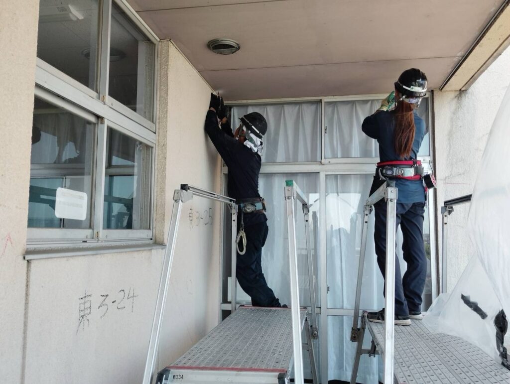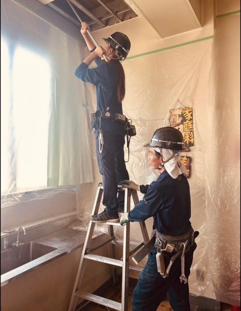 高所作業も、仲間がしっかりサポートしてくれているから安心。 丁寧に、慎重に、でもスピーディーに。 女性職人も当たり前に現場で活躍する時代です。 今日も現場はいい空気で進行中。