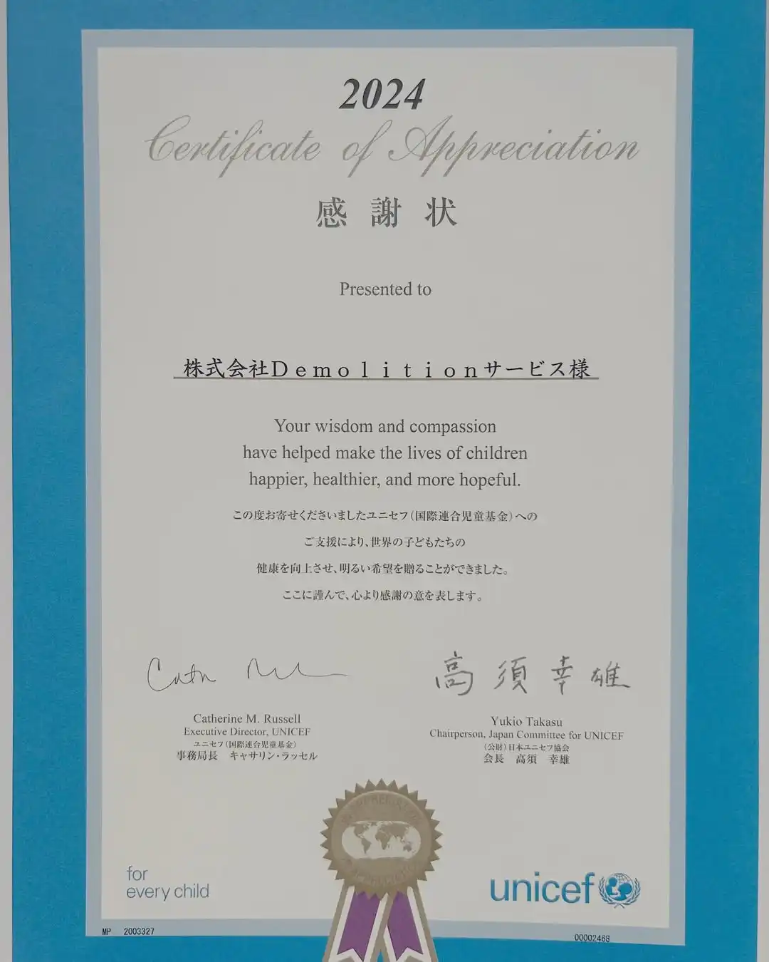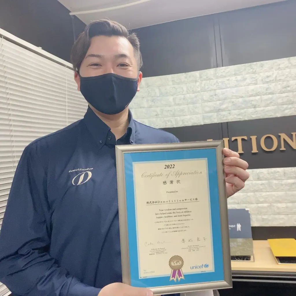 Demolitionサービスは、毎年ユニセフに募金を行い、その継続的な支援が評価され感謝状をいただいています。